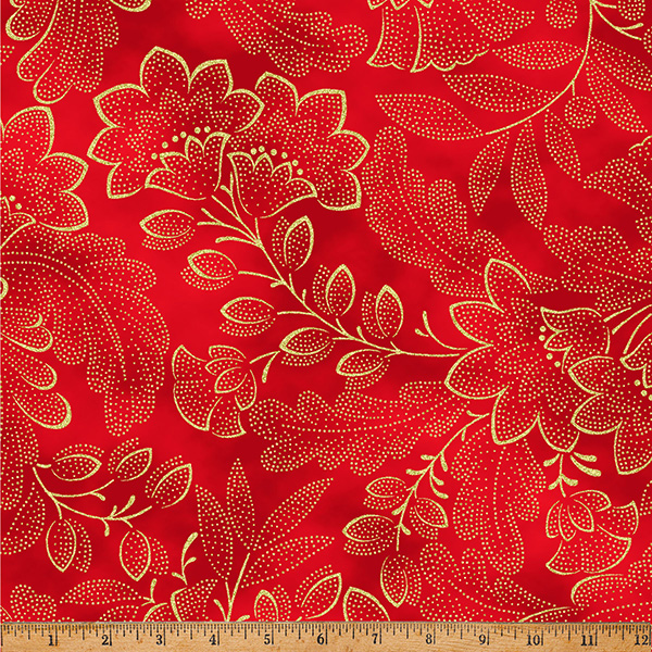 100% cotton screenprint with metallic accent. Approx. 44” wide. Avg. bolt 15 yards.