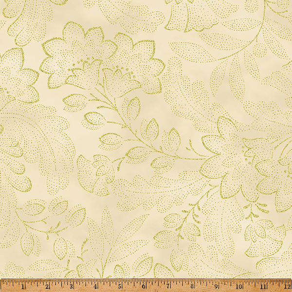 100% cotton screenprint with metallic accent. Approx. 44” wide. Avg. bolt 15 yards.