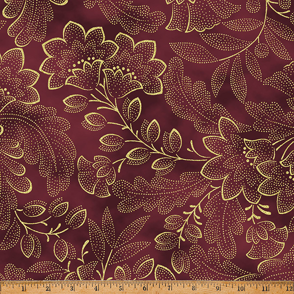 100% cotton screenprint with metallic accent. Approx. 44” wide. Avg. bolt 15 yards.