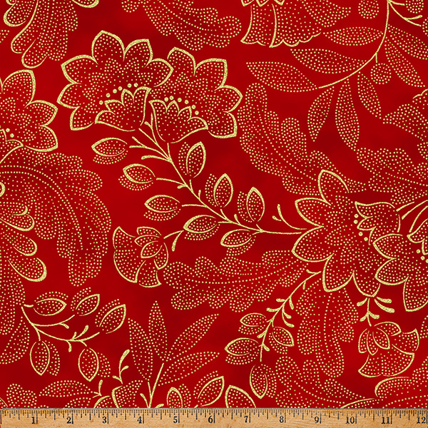 100% cotton screenprint with metallic accent. Approx. 44” wide. Avg. bolt 15 yards.