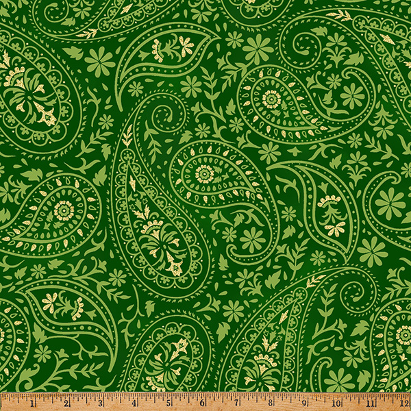 100% cotton screenprint with metallic accent. Approx. 44” wide. Avg. bolt 15 yards.