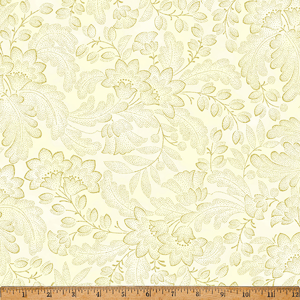 100% cotton screenprint with metallic accent. Approx. 44” wide. Avg. bolt 15 yards.