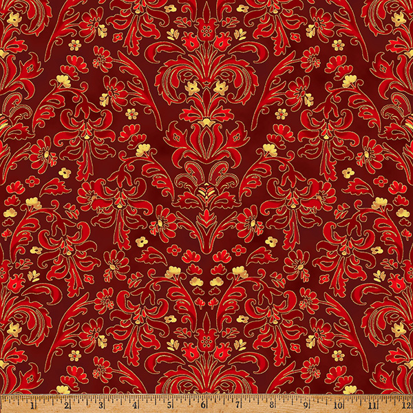 100% cotton screenprint with metallic accent. Approx. 44” wide. Avg. bolt 15 yards.