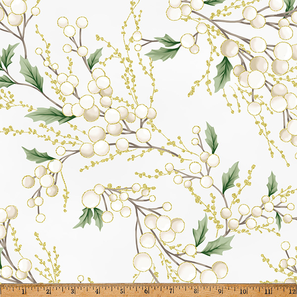 100% cotton screenprint with metallic accent. Approx. 44” wide. Avg. bolt 15 yards.