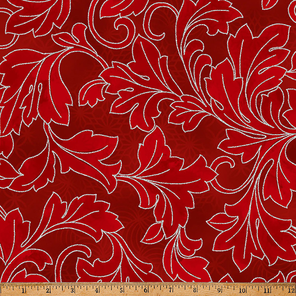 100% cotton screenprint with metallic accent. Approx. 44” wide. Avg. bolt 15 yards.