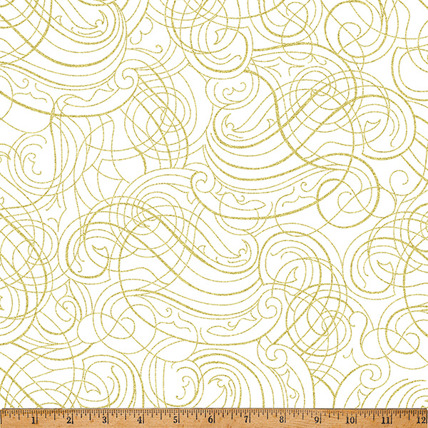 100% cotton screenprint with metallic accent. Approx. 44” wide. Avg. bolt 15 yards.
