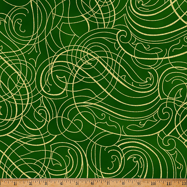 100% cotton screenprint with metallic accent. Approx. 44” wide. Avg. bolt 15 yards.