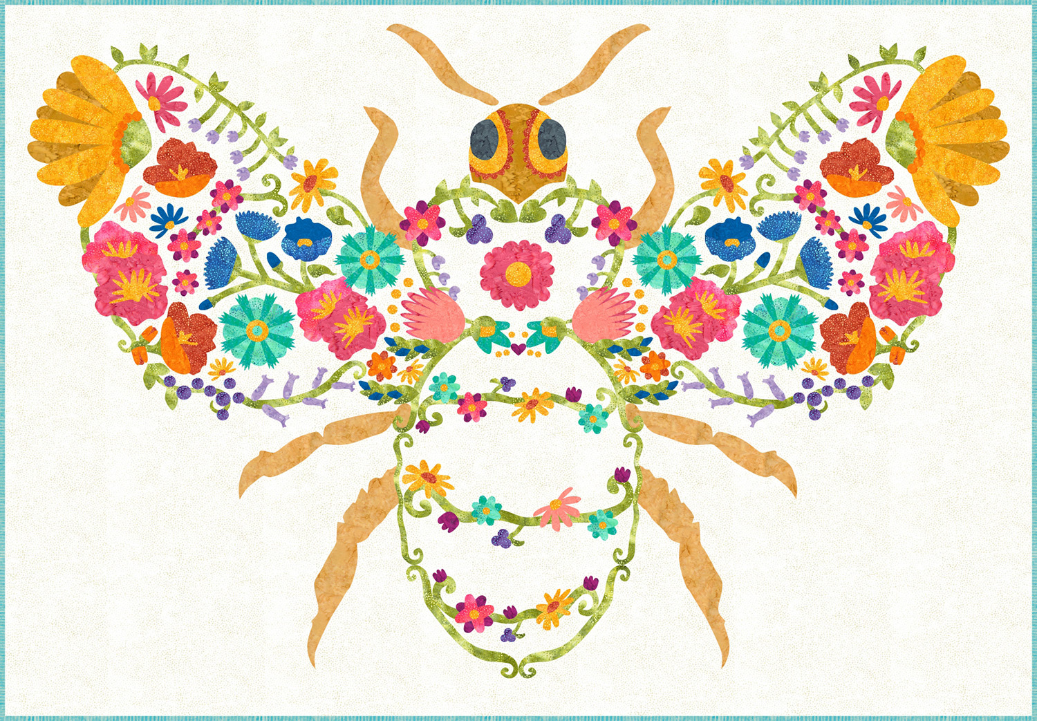 A stunning queen bee made of sweet florals and dancing vines, this wall hanging makes any space buzz with joy! Each kit includes all fabrics needed for one quilt top, plus binding. Pattern included. All applique fabrics are pre-cut and pre-fused, so you are ready to start sewing!