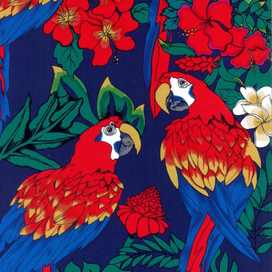 "Parrots." 100% cotton screenprint. Approx. 44" wide. Avg. bolt 15 yards.