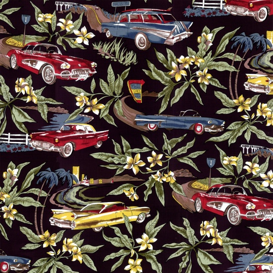 "Classic Cars." 100% cotton screenprint. Approx. 44" wide. Avg. bolt 15 yards.