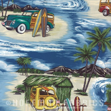 ”Surf Hut Woodies.” 100% cotton screenprint. Approx. 44” wide. Avg. bolt 15 yards.