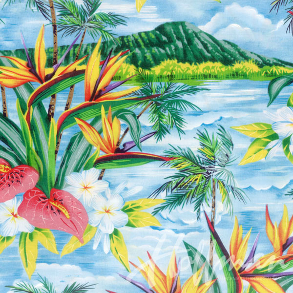 ”Tropical Bird of Paradise” 100% cotton screenprint. Approx. 44” wide. Avg. bolt 15 yards.